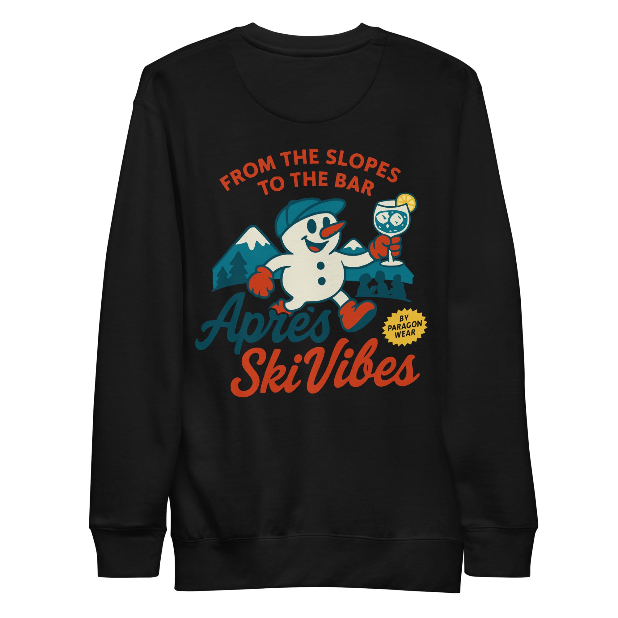 En la espalda, el diseño ocupa toda la superficie: un muñeco de nieve con copa en mano, montañas al fondo y el lema “From the slopes to the bar” marcando la vibra del après ski más auténtico. Un estilo retro, divertido y totalmente invernal, rematado con el sello “By Paragon Wear”.